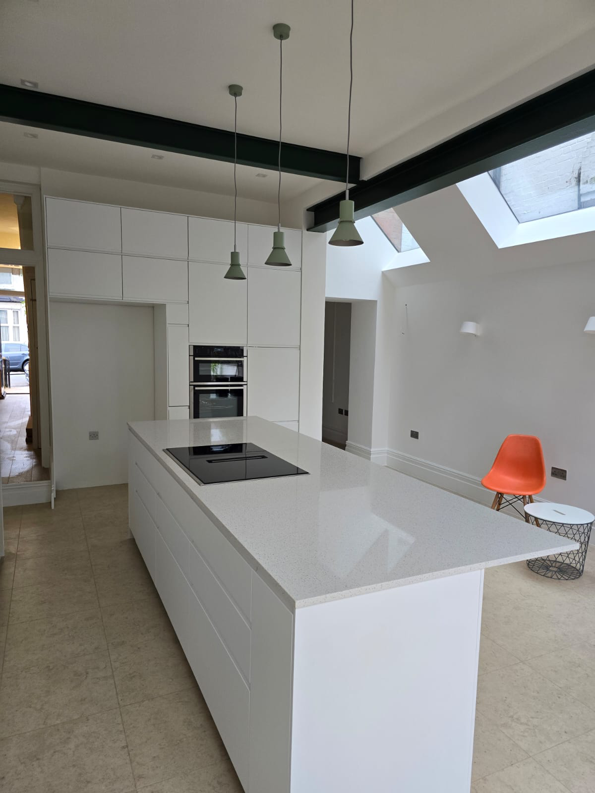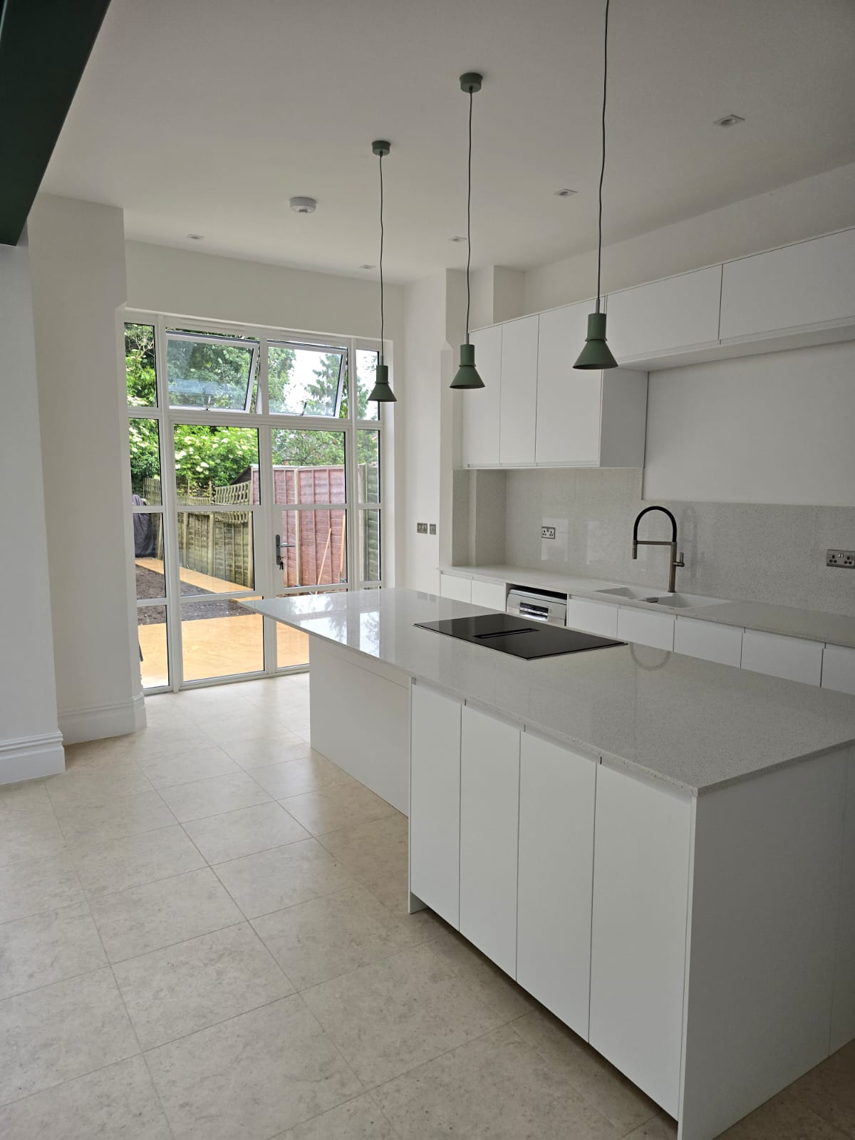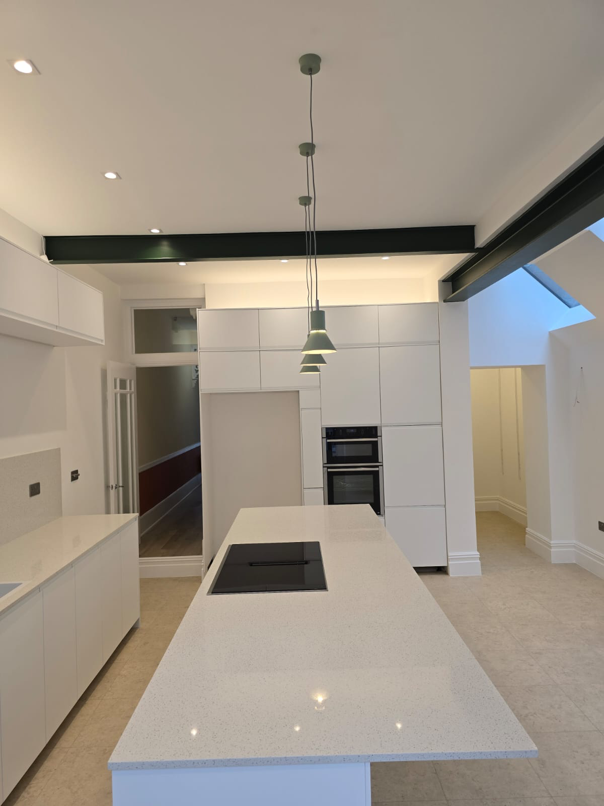 • Kitchen installation – fitted a modern, custom-made kitchen with handleless cabinets, integrated appliances, and a stylish quartz island.