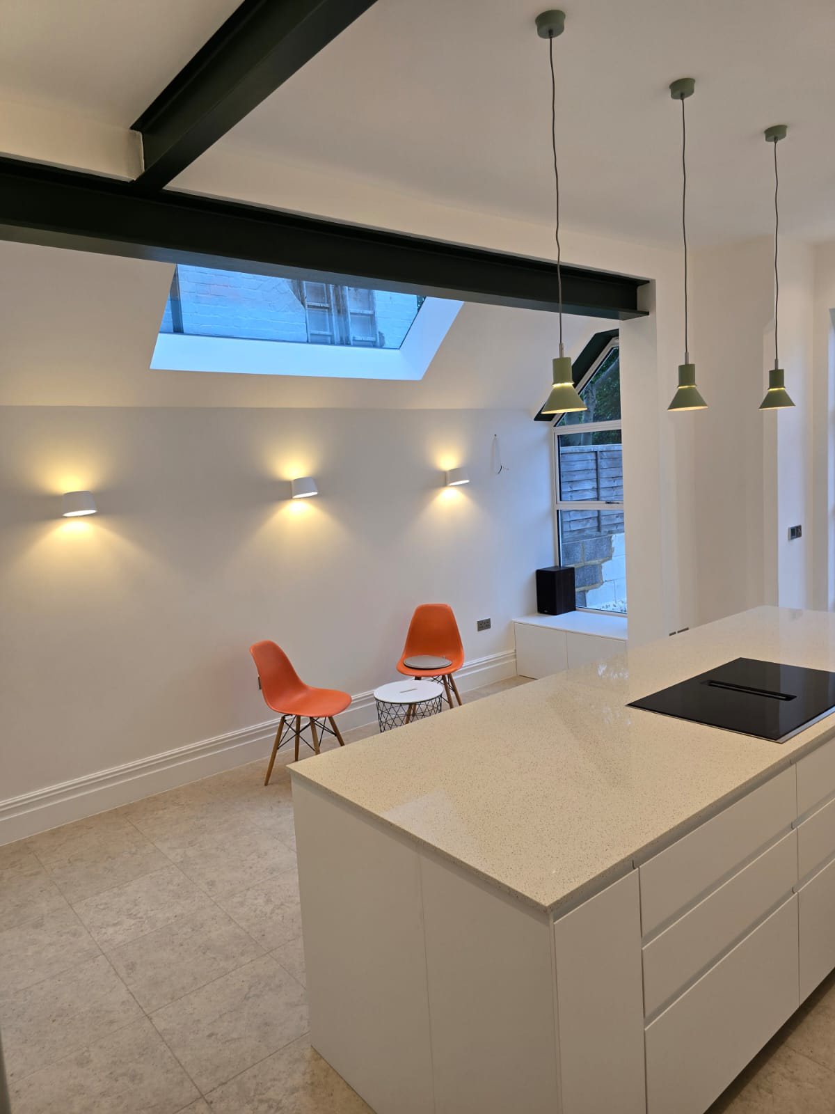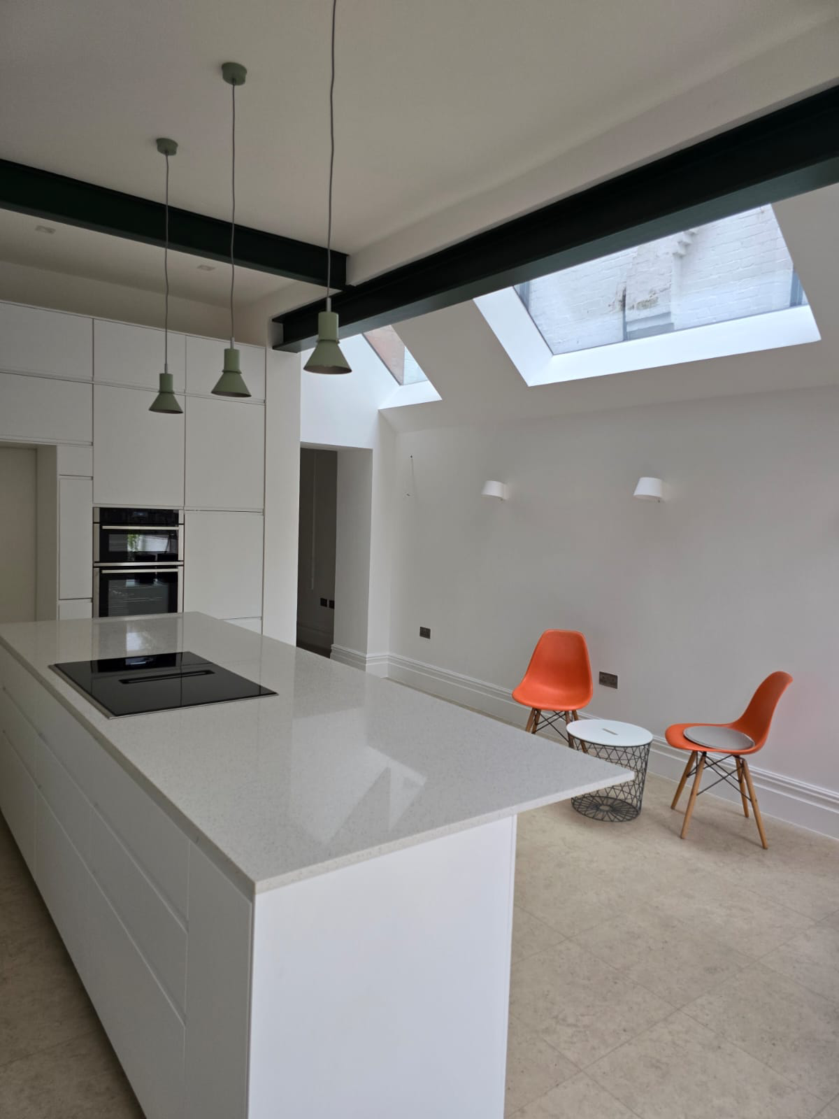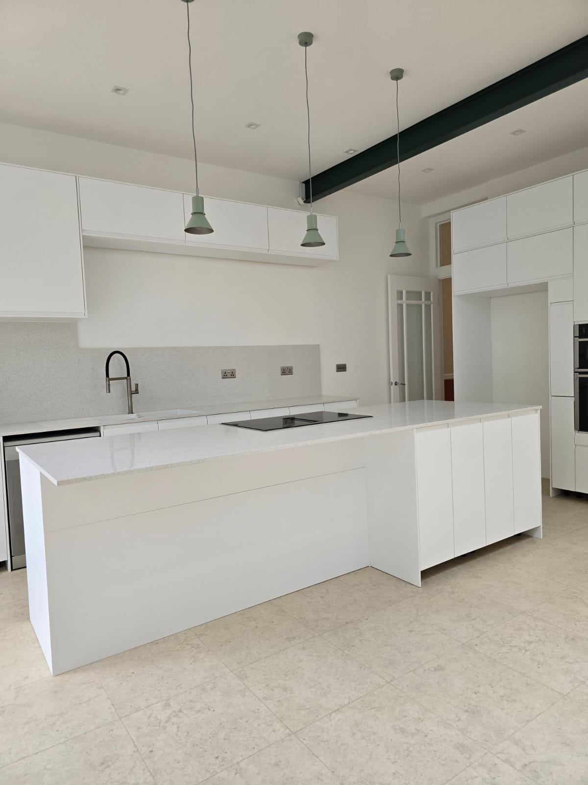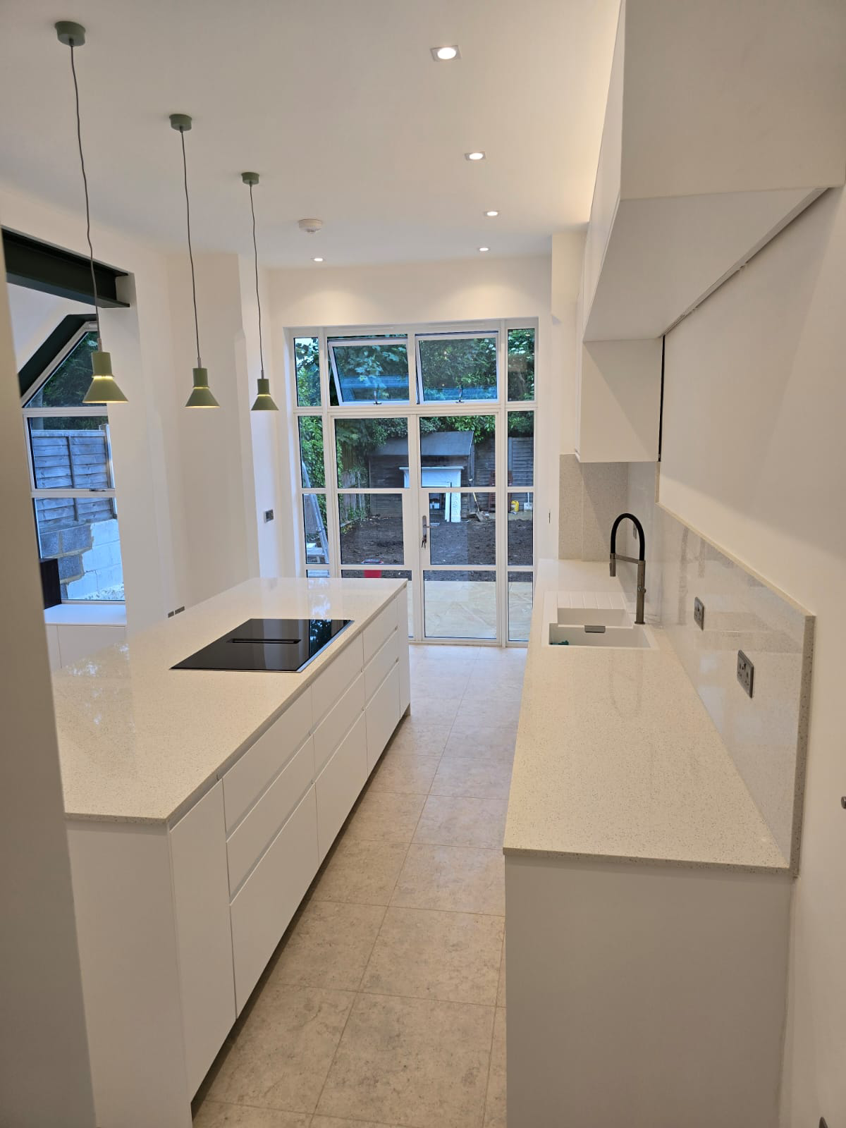 • Kitchen installation – fitted a modern, custom-made kitchen with handleless cabinets, integrated appliances, and a stylish quartz island.
