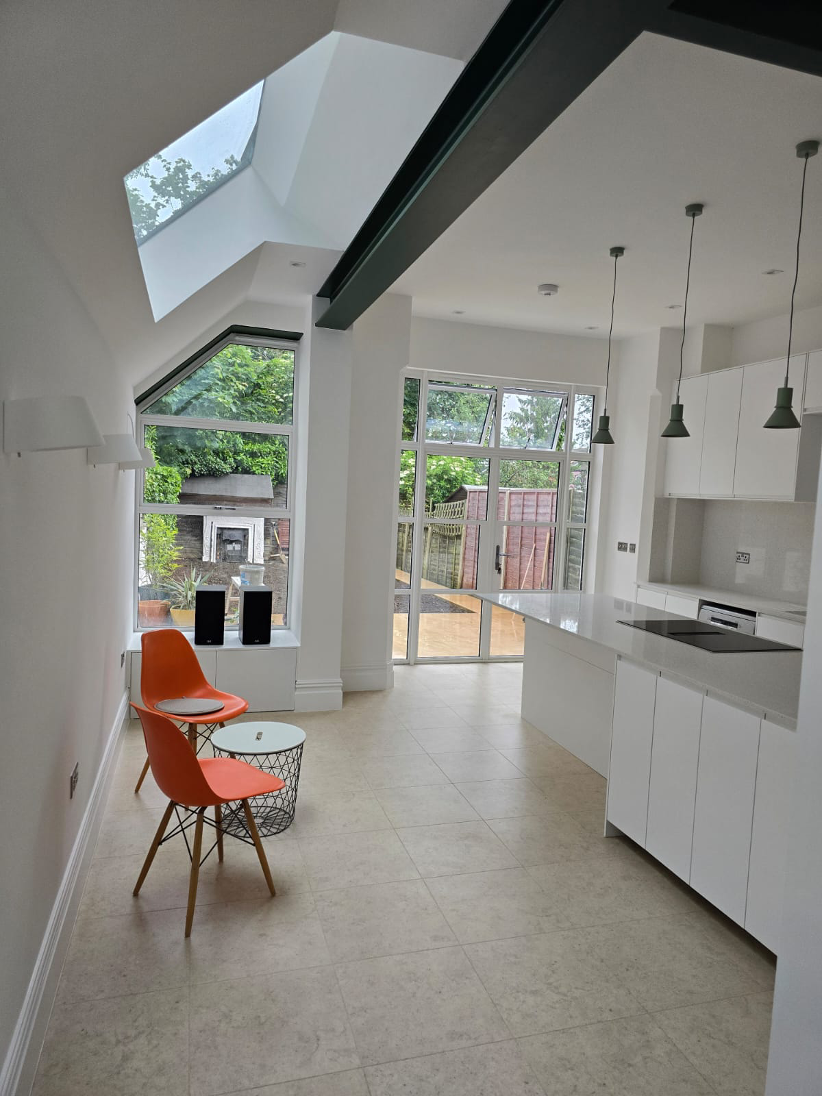 • Extension and glazing – built a new rear extension with large glass doors and skylights to bring in more natural light.